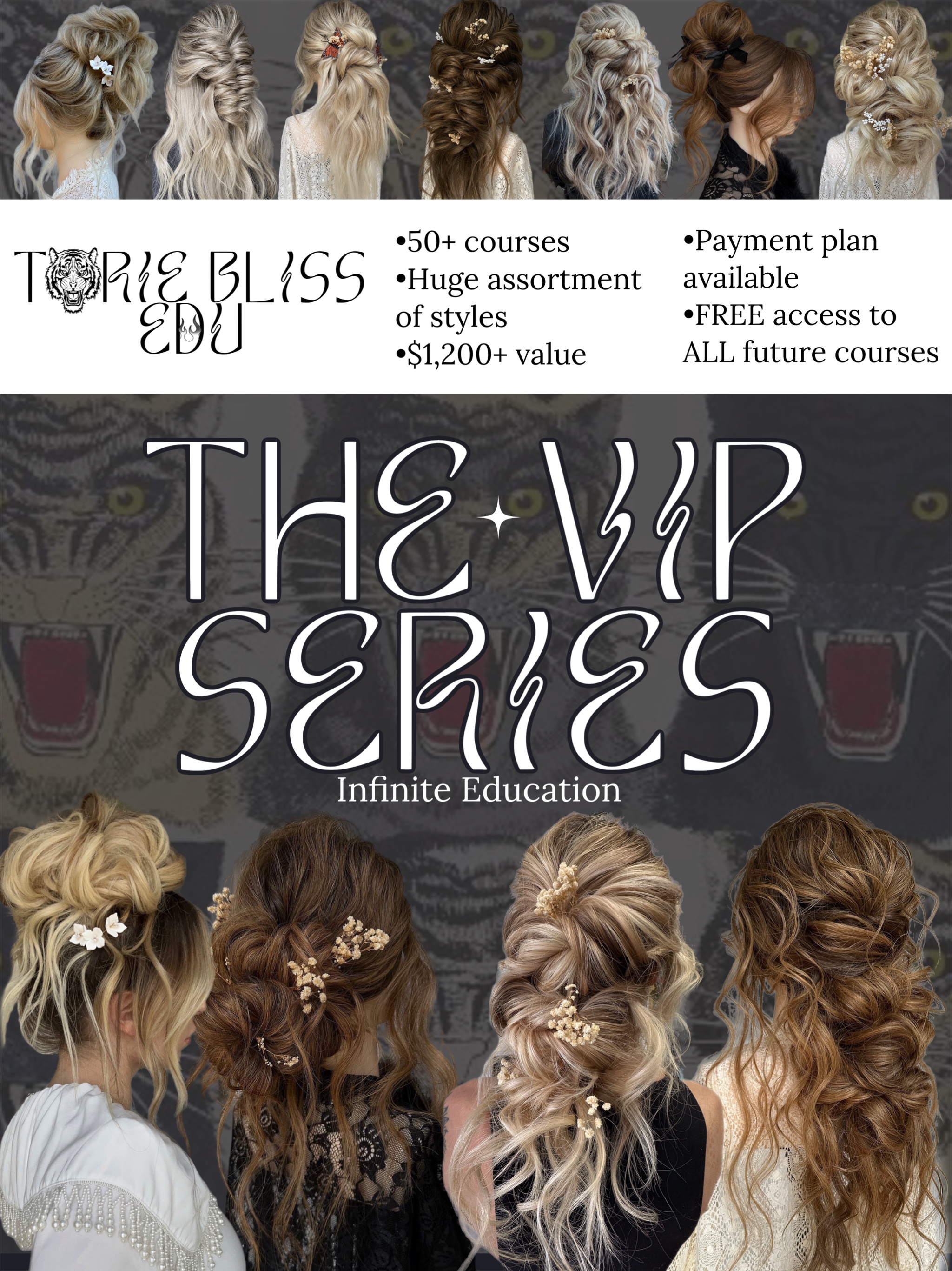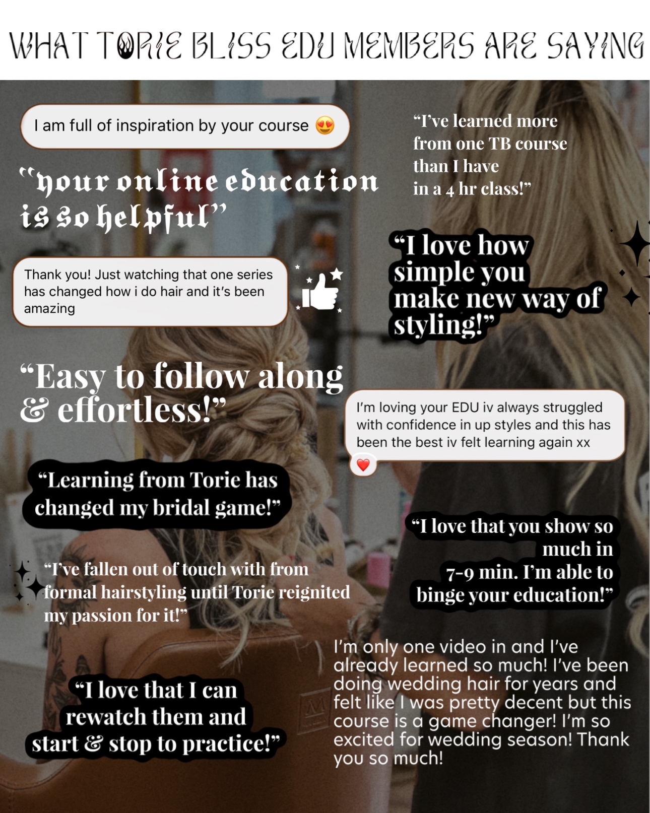 Hi! Thanks so much for stopping by Torie Bliss Edu! I am the creator behind Torie Bliss Edu , @torielynnbliss and @torieblissedu ! I have been a licensed hairstylist for 15 years! No joke it has been my dream job since I was a kid, it was always my answer when anyone asked “what do you want to be when you grow up?” I taught myself how to french braid and fishtail on my Barbie’s when I was little, not much has changed now that I style full size “Barbie’s” (mannequin heads) for a living. I was the kid that told my mom exactly where I wanted my ponytail before I could do it myself! I retired from behind the chair a couple of years ago which may sound silly in your 30s but my other dream job was to be a mom. I have 2 amazing daughters 9 & 3. When I decided to become a stay at home mom/homeschool mom my love for the hair industry didn’t go away it just shifted to a new endeavor and I feel more aligned than ever! While working behind the chair I didn’t think I would ever be an educator (those were the stylist I looked up to, how would I ever be good enough?) All that changed about 7 years ago when the opportunity fell onto my lap because of instagram. I am forever thankful because it quickly became my absolute favorite thing! The joy I feel giving other stylists confidence in themselves and “ah ha” moments is like nothing else I’ve felt in my career (that’s saying a lot because I’ve had some amazing moments in my career). These are just some of the things that have brought me to where I am today. I am so happy to have you here and can’t wait to teach you all of my hair secrets & become hair besties! Happy Styling!